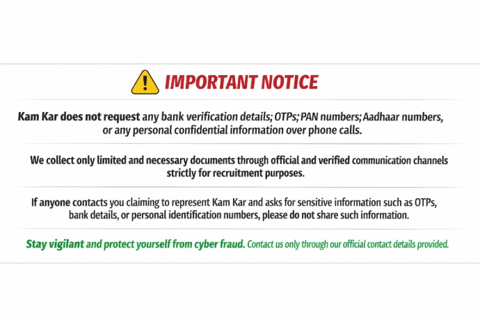 Kam Kar does not request any bank verification details, OTPs, PAN numbers, Aadhaar numbers, or any personal confidential information over phone calls.